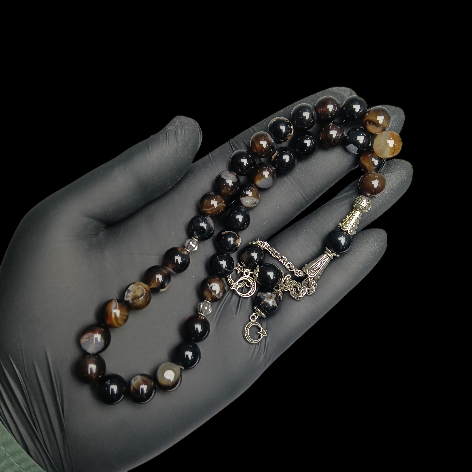 یہ شاندار تسبیح قدرتی کالی سلیمانی عقیق (Black Sulemani Aqeeq) کے اعلیٰ معیار کے 33 دانوں پر مشتمل ہے، جو نہایت نفاست سے تراشے گئے ہیں۔ کالی سلیمانی عقیق کو روحانی تحفظ، منفی توانائی سے بچاؤ، اور اندرونی سکون کے لیے خاص اہمیت حاصل ہے۔ اس کے ہر دانے میں قدرتی خوبصورتی، گہرے رنگ اور دھاریوں کا حسین امتزاج نمایاں ہے۔ مضبوط دھاگہ اور عمدہ کاریگری اس تسبیح کو پائیدار اور دیدہ زیب بناتے ہیں۔ ذکر، مراقبہ، اور تحفے کے لیے ایک مثالی انتخاب، جو روحانی وقار اور حسن کا امتزاج پیش کرتا ہے۔