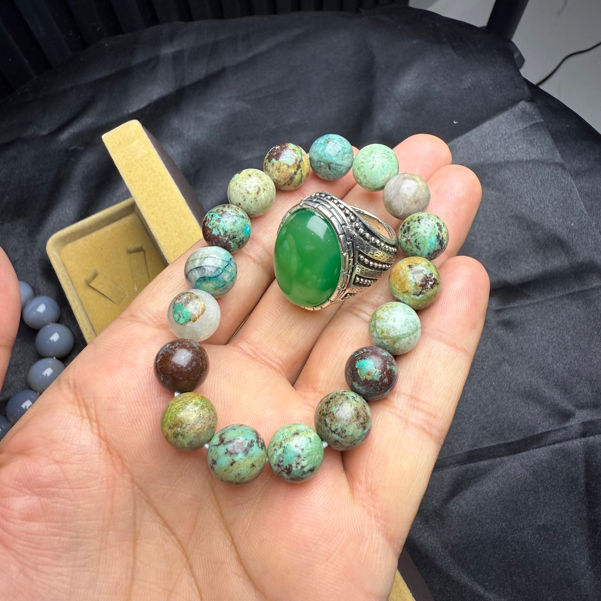 Green Aqeeq Ring with Stone Bracelet – Natural Stone Set